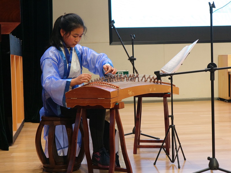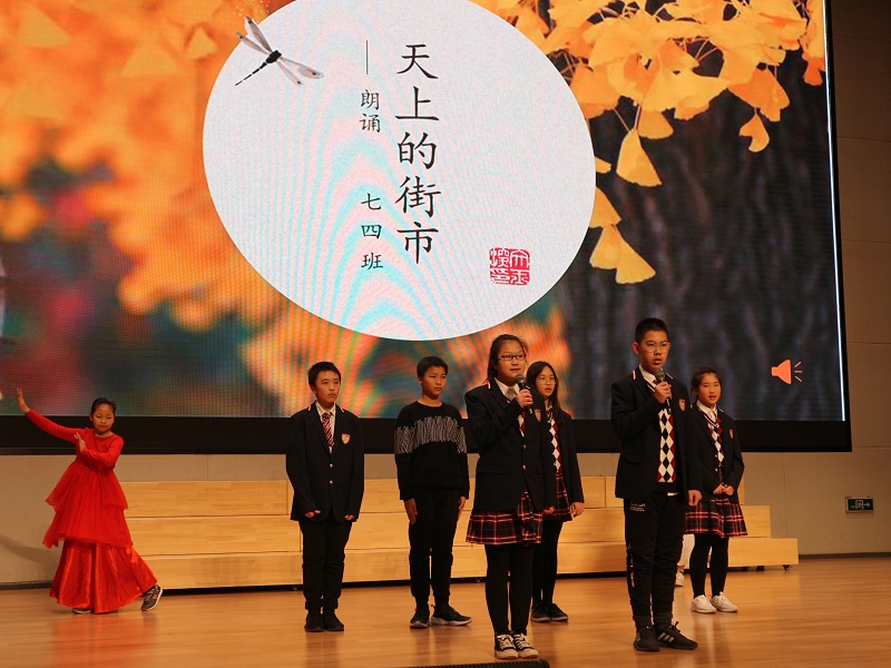 撑着油纸伞,独自彷徨在江南的《雨巷》。那雨巷,一如既往的悠长,一如既往的寂寥,我总希望逢着一个丁香一样地结着愁怨的姑娘,一起回顾青葱岁月,一起品一品林徽因的《你是人间的四月天》,唱一唱木心的《从前慢》。烟雨渐停,仰望天际,思绪悠悠。我不禁遐想, 《天上的街市》里到底都有些什么……七(7)班的《你是人间的四月天》、七(3)班的《从前慢》、七(4)班的《天上的街市》以及伍少坚、祝贺老师带来的表演《雨巷》,一首首动人的诗词歌赋,伴着悠扬的乐曲,从心中喷发出的深情,令观看演出的同学们沉醉在经典诵读的殿堂之中。诵读千古美文,传承华夏文明。