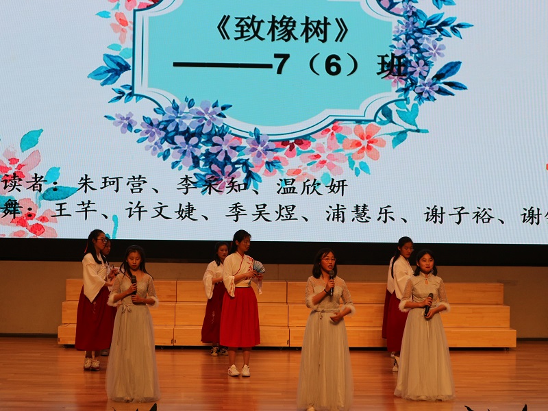 人最深的感情,莫过于一种情怀。七(1)班带来的《乡愁》,是海外游子对祖国恋恋不舍的一份情怀,感染了无数华夏儿女。七(5)班的《再别康桥》,仿佛带着大家回到1928的那个夏日,在康桥的柔波里,浮想联翩,情怀激荡。七(3)班带来的诗朗诵《母亲 清明 老山 烈士墓》,深情地诉说着烈士饱经风霜的母亲回想起儿子的悲痛,令人泪流满面。七(2)班的《生如夏花》,展现了诗句的沉静、淳朴与华美,让人心灵纯净、幸福与安宁。而江俊老师带来的歌曲《多情的土地》,抒发了对祖国土地的无比眷恋和赞美,全场响起了热烈的掌声。