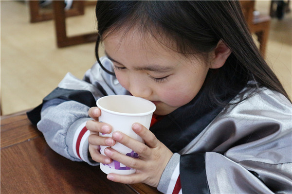 为了满足孩子们的愿望,李品谕老师为孩子们泡了一壶花茶。李老师以实践告诉孩子们泡茶讲究水源、水品、水味、水质,并在器皿与环境的选择上需要谨慎。清新怡人的花茶泡好后,李老师带着孩子们闻香品茗,孩子们沉浸在茶味的清香与芬芳中,感受到苏州茶文化的厚重。