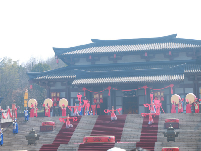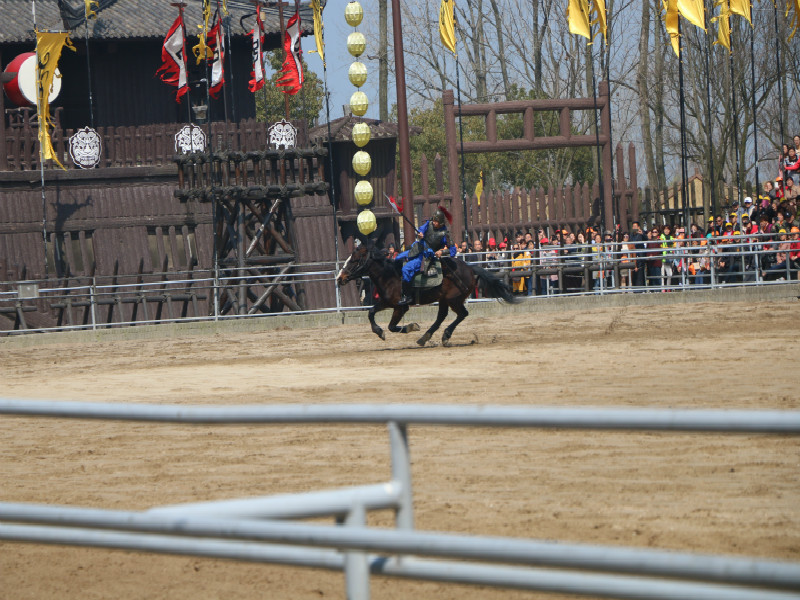 经过中心广场的巨大汉鼎,我们来到三国时期重要的关隘——虎牢关。在这里,我们观看了一场惊心动魄的“三英战吕布”。红日炎炎,黄沙漫漫,鼓声隆隆,风声萧萧,马鸣嘶嘶,我们仿佛置身于硝烟四起的古战场。只见三国群雄遮拦架隔无休歇,只闻喊声震动天地翻。技艺精湛的演员们将刘、关、张三人的大仁、大义、大忠、大勇之姿演绎得淋漓尽致,赢得台下观众阵阵呐喊。
