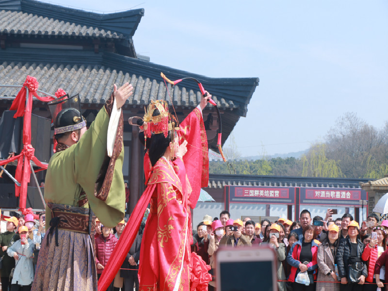 观赏完“三英战吕布”,我们继续前行,来到气势恢宏的吴王宫。吴王宫背倚青山,白墙青瓦,宫门前侧立的两座阙楼,是三国景点中最高的建筑物,气势非凡。“刘备招亲”的大戏正在精彩上演。钟鼓悦耳,舞姿悦目,将三书六礼的仪式烘托得更加隆重典雅。壮观的古典建筑融入悠久的历史文化,使观众感觉自己仿佛穿越了时空,来到多情、多义的三国时代。