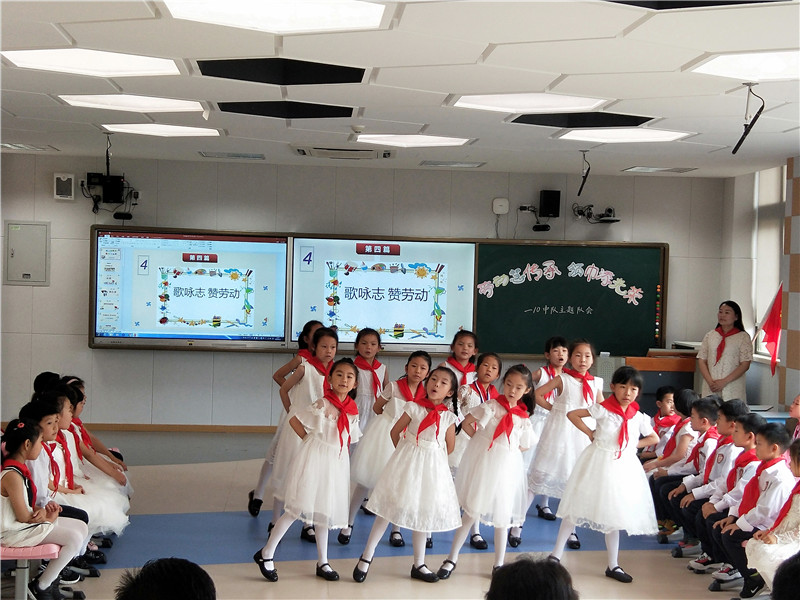 队员们高唱“我们是共产主义接班人……”嘹亮的歌声为队会拉开了帷幕。本次队会筹备了近两周的时间,由一10中队的全体队员分工合作、自主搜集材料,排练合唱、歌舞、三句半、舞台剧等丰富多彩的节目,小队员们表现得非常积极主动,整个队会的准备非常充分。过程中,队员们热情高涨,参与度高,极大地起到了德育渗透,将热爱劳动的种子根植在每一位队员心中。