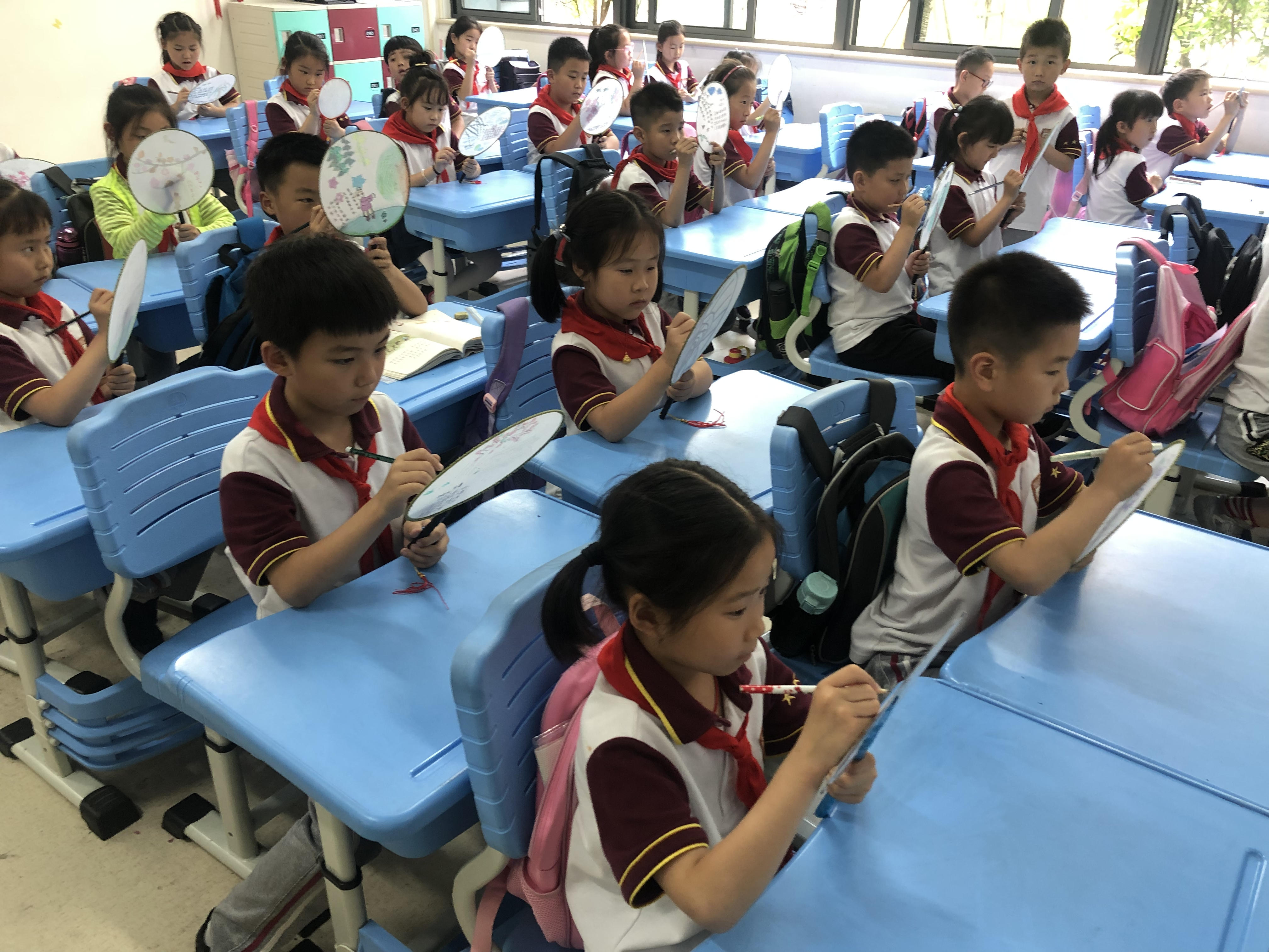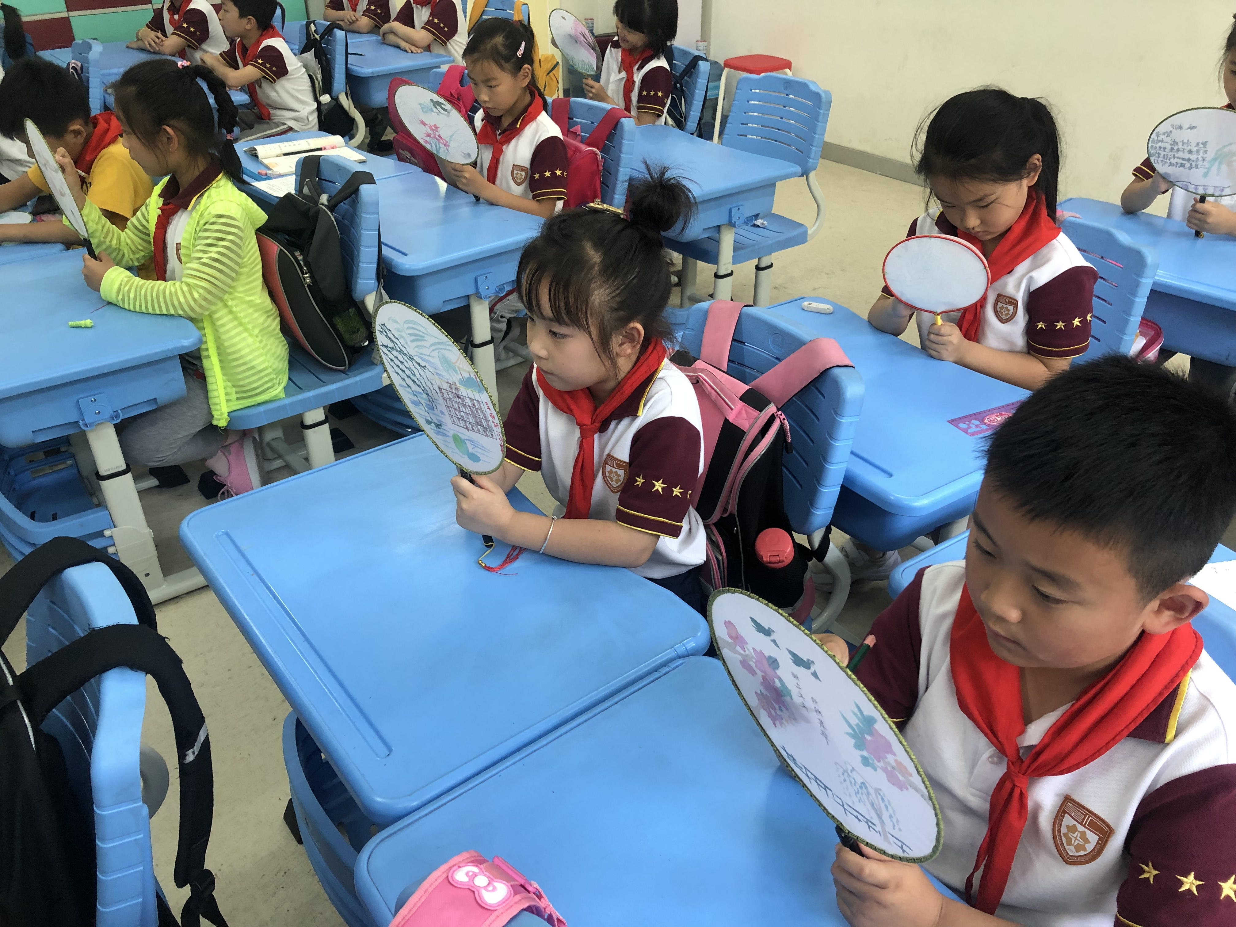 老师们为孩子提供了空白团扇、墨汁及国画颜料等材料,同学们还拿出了美术课上的彩笔、勾线笔、秀丽笔等工具,大家纷纷拿着画笔在扇面上开始自己的“大作”,在一节课的涂涂画画之后,精美的扇面新鲜出炉了。画扇面时,孩子们专注的小心翼翼的落笔,将颜色缓缓晕开,紧张的深情才舒展开来,完成绘画后,孩子们在扇面上或提上诗句,或写上祝福,最后落款敲章。