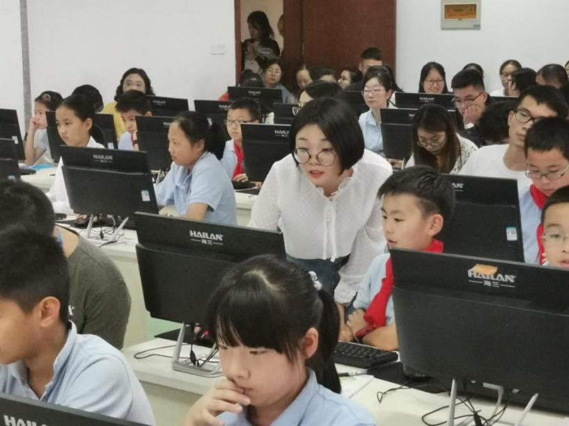 比赛当天,来自江苏省各地区的27位信息技术老师分三个机房展开了同题异构的会课角逐。精彩的教学设计,多样的技术手段,展示出每一位教师良好的专业素养和教学水平。葛盼盼老师执教的五年级《Scratch画正多边形》一课,以Scratch绘制的漂亮图形导入,引发学生想自己动手操作的冲动。依托园区易加互动学习平台发布的在线课程,引导学生通过小组合作,用自主探究的方式总结出画正多边形程序脚本搭建的规律。在作品展示环节,通过易加互动学习平台作业上传模板在线上传完成程序作品,再引导学生相互在线点赞评价,然后全班整体展示点评。这种对程序作品在线展示评价的方式有创新亮点,让观摩老师的评委眼前一亮,最终获得本届“蓝天杯”会课二等奖。