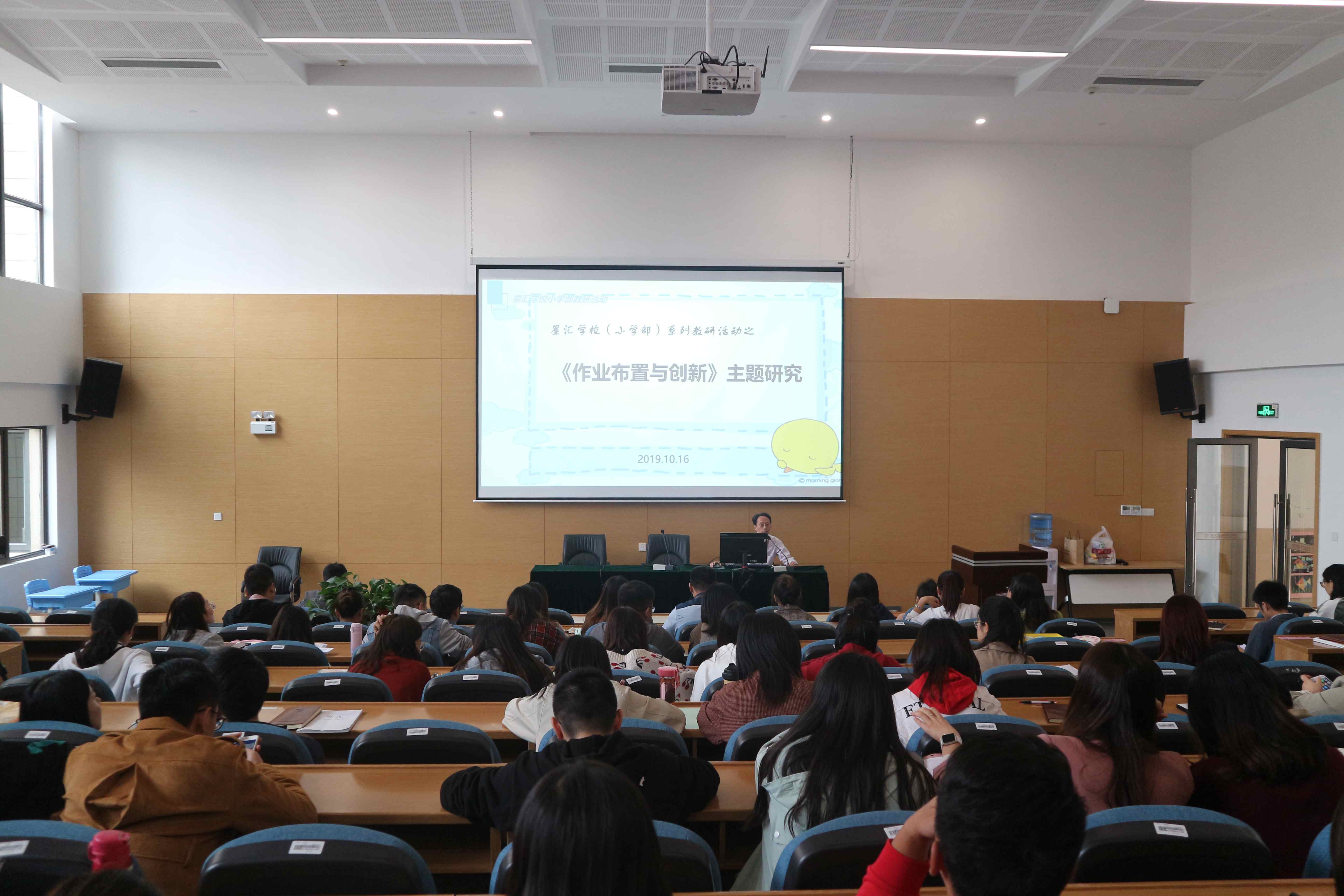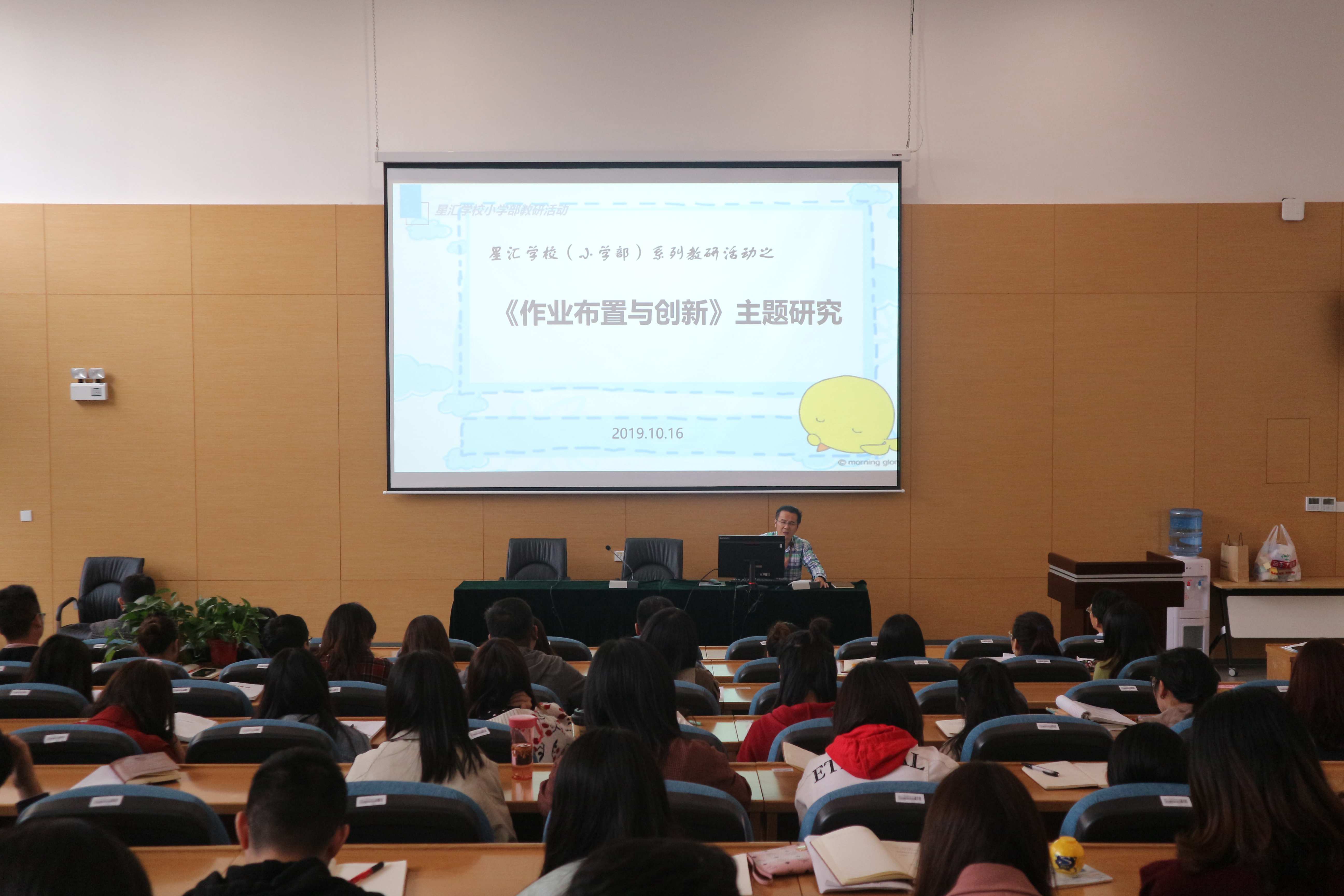 星汇学校小学部于2019年10月16日在二楼阶梯教室召开以“作业布置与创新”主题研究的教研活动。本次活动由教导处罗钢老师主持,谢剑雄校长及全体小学部教师参加了本次活动。