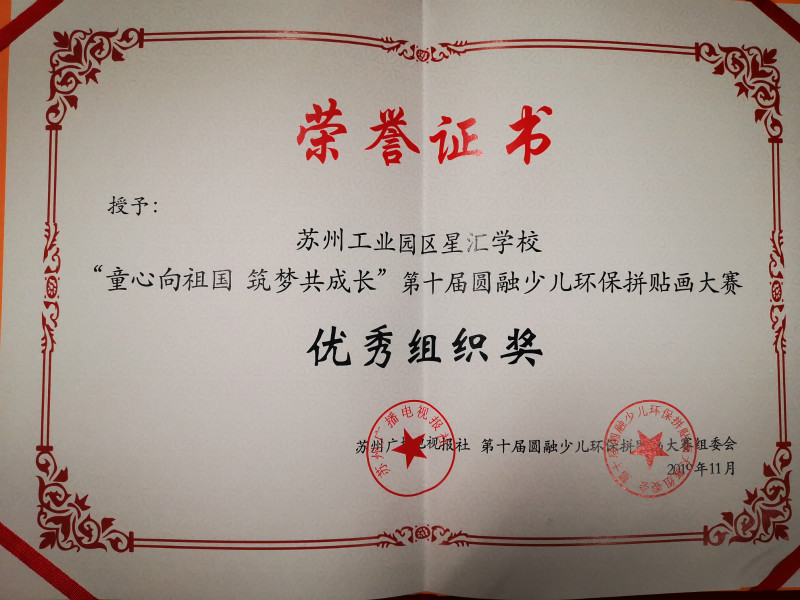 同学们在这次圆融少儿环保拼贴画大赛中收获颇丰,其中有4位同学获得了二、三等奖,恭喜获奖的同学们,希望他们能够再接再厉!另外,在美术组各位老师的团结合作下,星汇学校在此次比赛中成绩突出,荣获“优秀组织奖”。