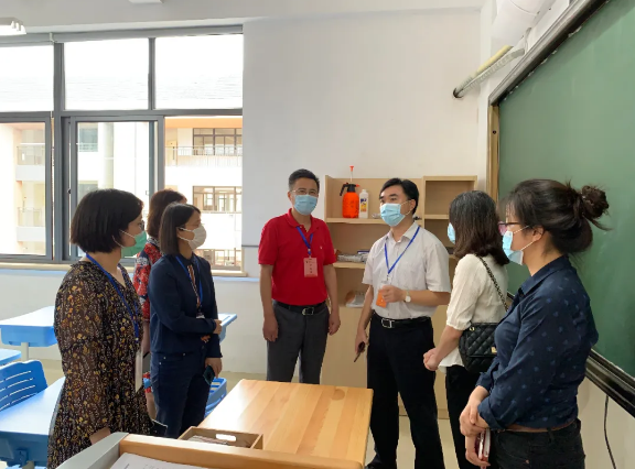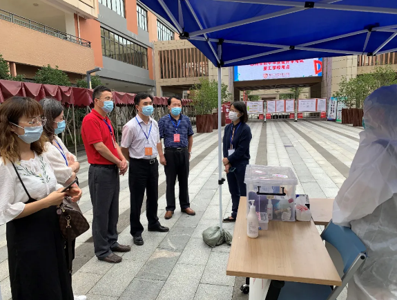 指导组一行在星汇学校中考考点主考谢剑雄校长的陪同下,重点检查了学校中考期间疫情防控工作,听取了学校前期中考疫情防控准备工作、中考期间防控应急处理预案以及防控物资储备情况,对星汇学校中考考点的疫情防控准备工作给予了高度评价。